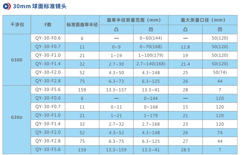 標(biāo)準(zhǔn)鏡頭有F0.6,F(xiàn)0.7,F(xiàn)1.0,F(xiàn)1.4,F(xiàn)2.0,F(xiàn)2.8,F(xiàn)5.6,可定制其他F數(shù)的鏡頭,也可選配平面標(biāo)準(zhǔn)鏡及相關(guān)治具測(cè)量平面鏡。